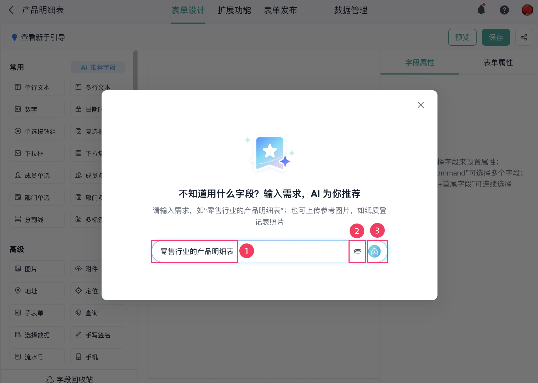 AI 推荐字段功能,可以根据用户需求(支持文字和图片输入)智能推荐表单字段。并可一键添加到表单,大幅提升表单搭建效率。